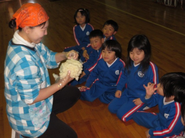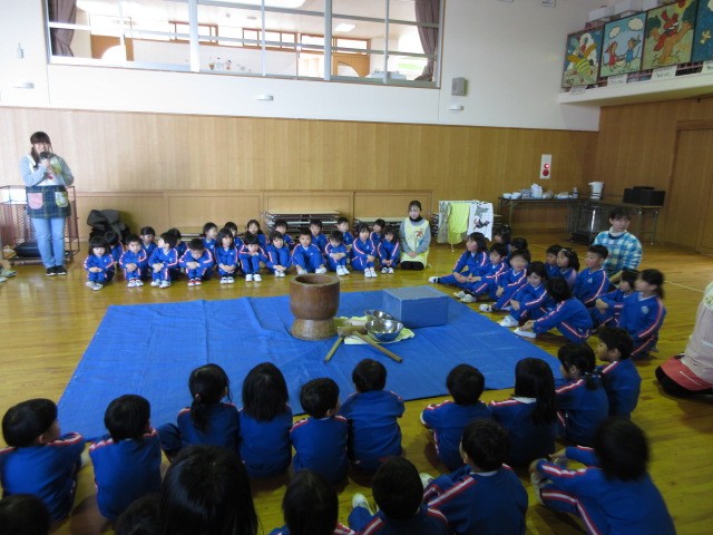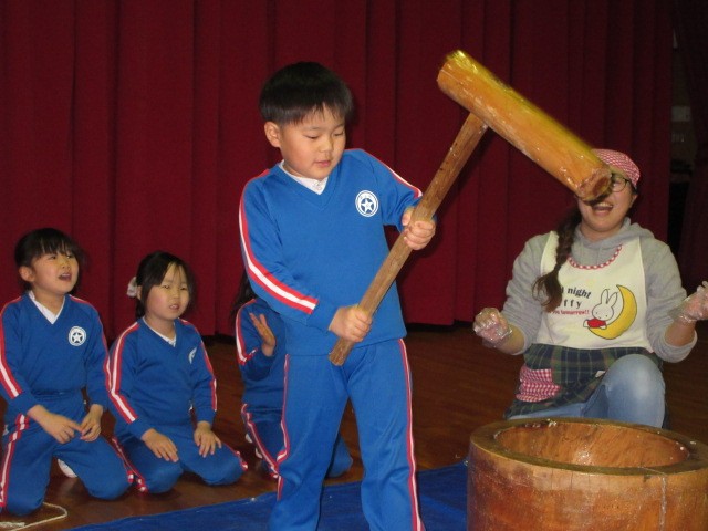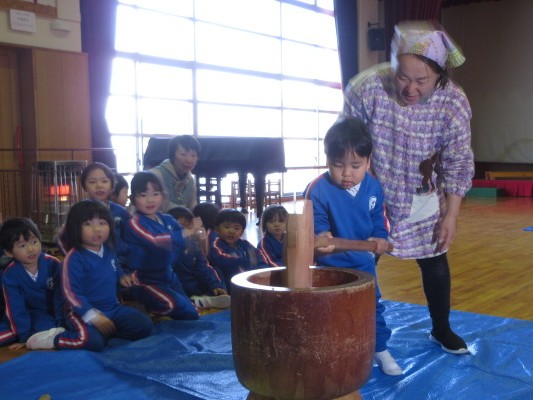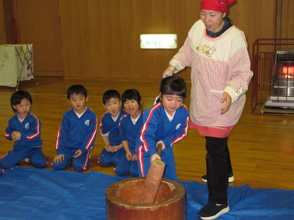 「よいしょ!」の掛け声に合わせてもちをつくとホールの床が「ドン!」と響いて、子どもたちから「おお~~っ!!」と驚きや感嘆の声が上がっていました。