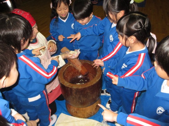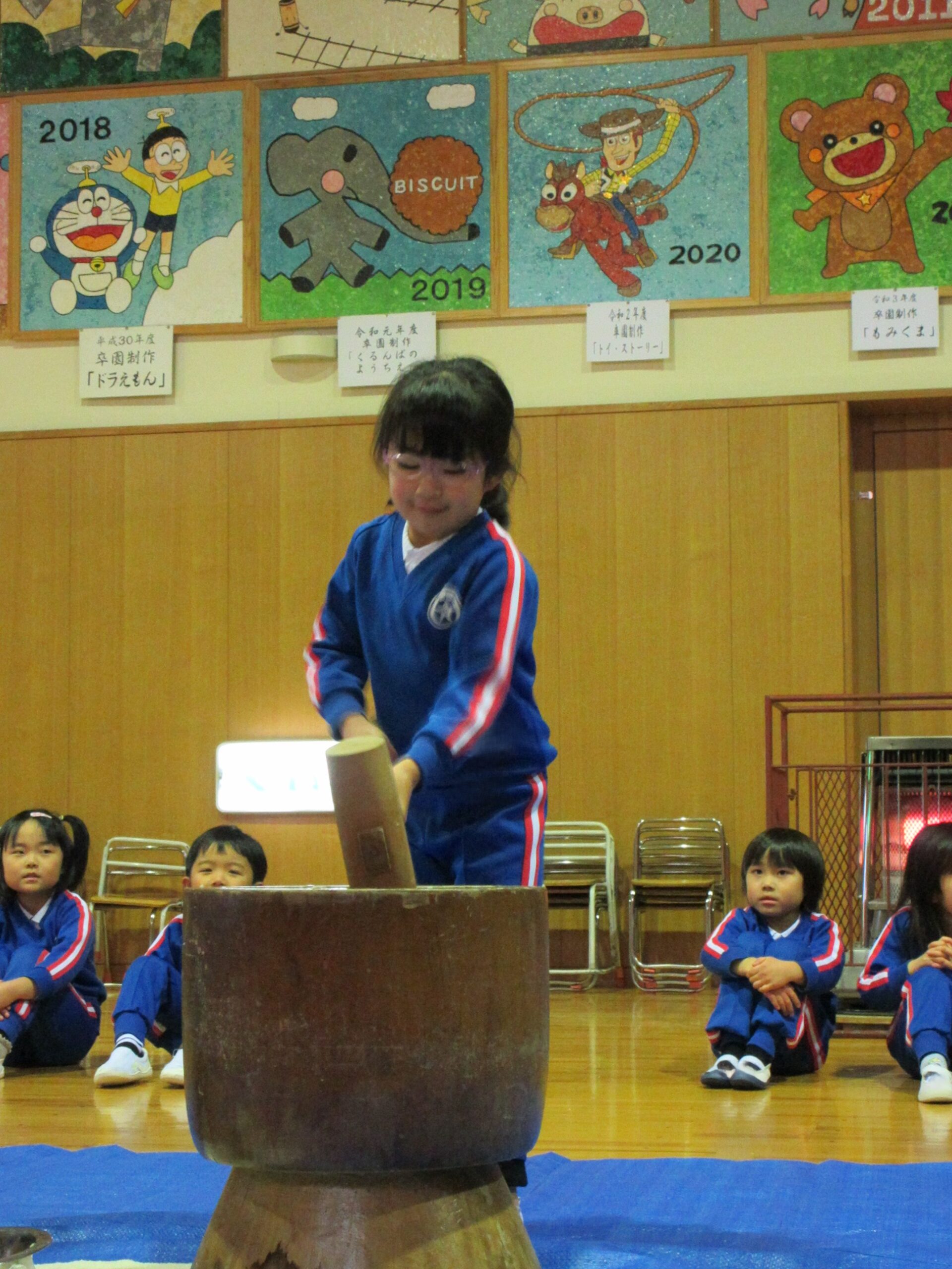 1月26日、全園児でもちつきをしました。なかなか普段触れる事の出来ない『臼』や『杵』に触れ、実際にもちをつくことができる貴重な体験に、子どもたちはわくわく💗