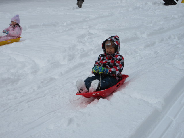 そりすべり場はふっかふかの新雪でした! まずはそりすべり場を散策。