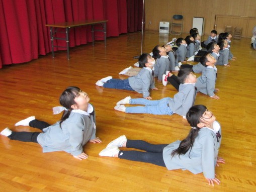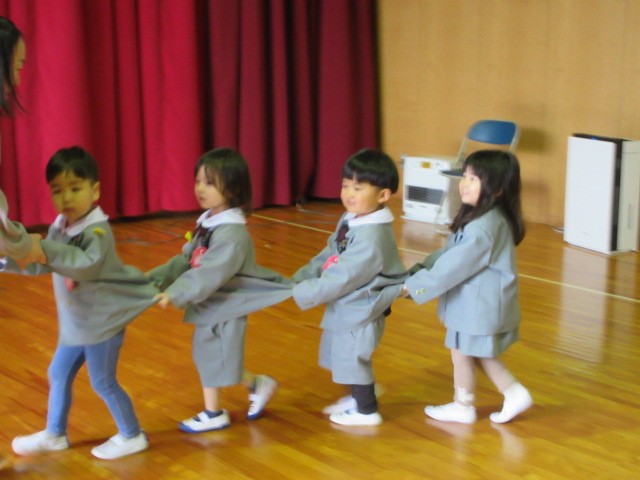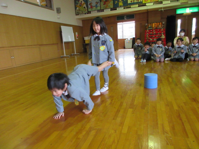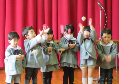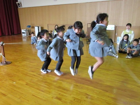 2月27日、全園児が集まる「もみじの日」がありました。この日は、各クラスごと、「できるようになったこと」をみんなに見てもらう、‘’できるようになったこと発表会‘’をしました。
